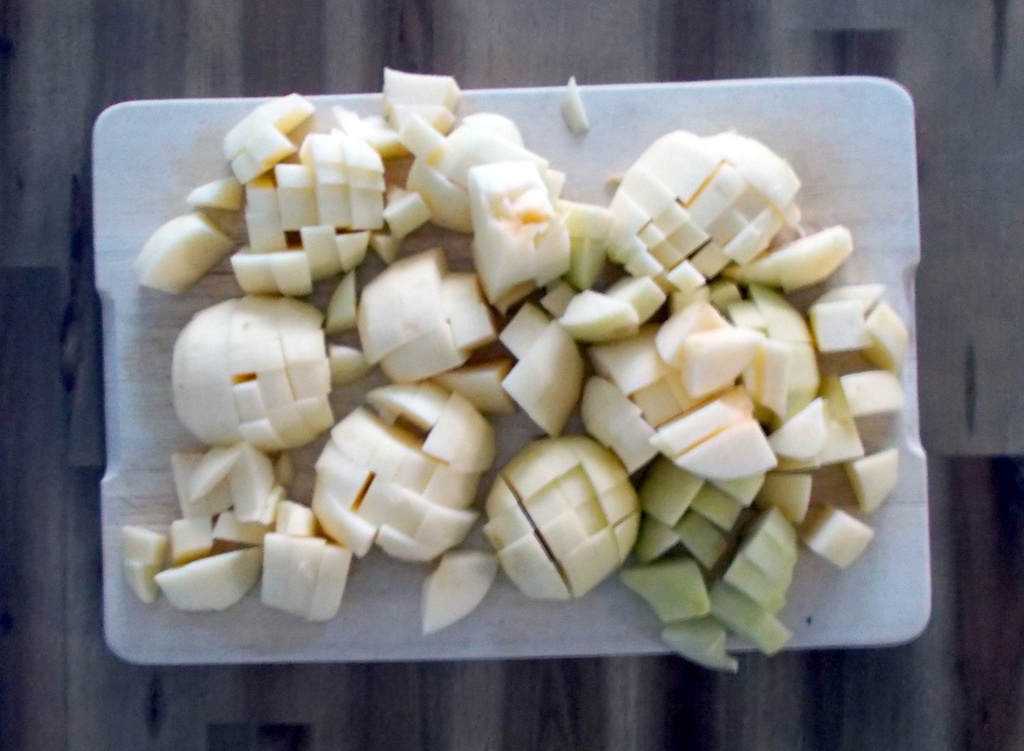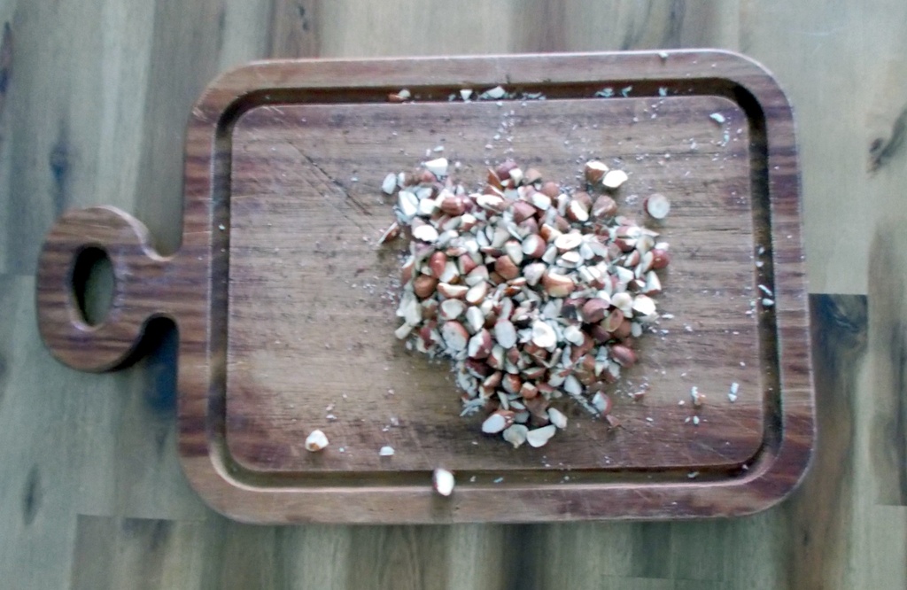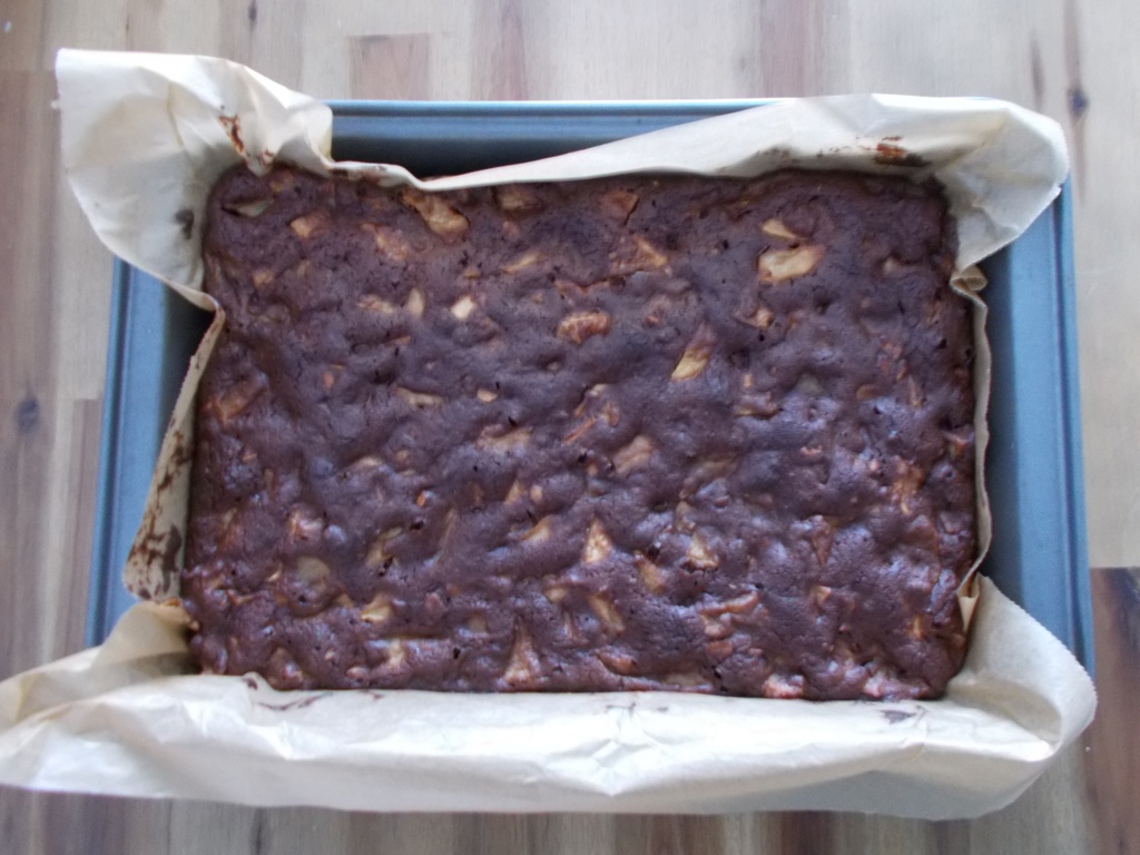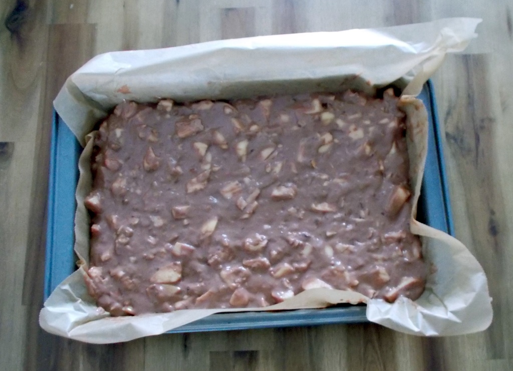 Jabłka obrać, usunąć gniazda nasienne, a następnie pokroić w kostkę. Jajka utrzeć razem z cukrem na jasną masę. Następnie dostać pozostałe składniki i mieszać do ich połączenia. Pod koniec dodać jabłka i rozdrobione orzechy i wszystko razem wymieszać.